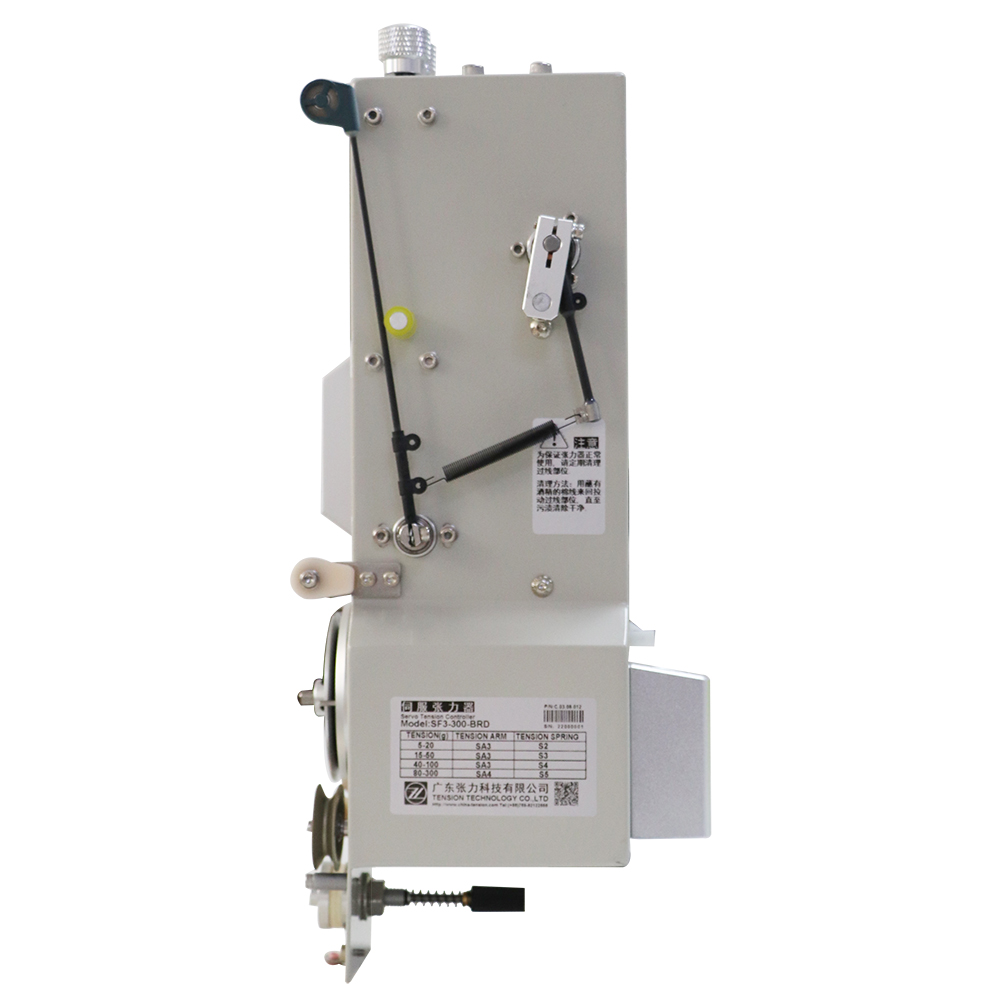 SF3-BRD系列帶氣缸且張力輪在正面的伺服張力器。該系列產(chǎn)品最高繞線速度可達(dá)20m/s,其氣缸裝在機(jī)殼內(nèi)部,具有衰減功能,未接通氣壓時(shí),可通過張力調(diào)節(jié)旋鈕和擺動(dòng)臂上下旋鈕來控制張力;在繞線、掛線等過程中的某段需要較大的張力時(shí),可接通氣壓,此時(shí)繞線機(jī)通過電磁閥對(duì)氣閥進(jìn)行切換控制,使擺動(dòng)臂擋塊擺動(dòng)一定的角度,實(shí)現(xiàn)兩段張力值的切換,避免發(fā)生斷線。該系列具體型號(hào)及配置見右側(cè)表格,用戶可根據(jù)自用線徑及張力范圍選擇合適的型號(hào)。